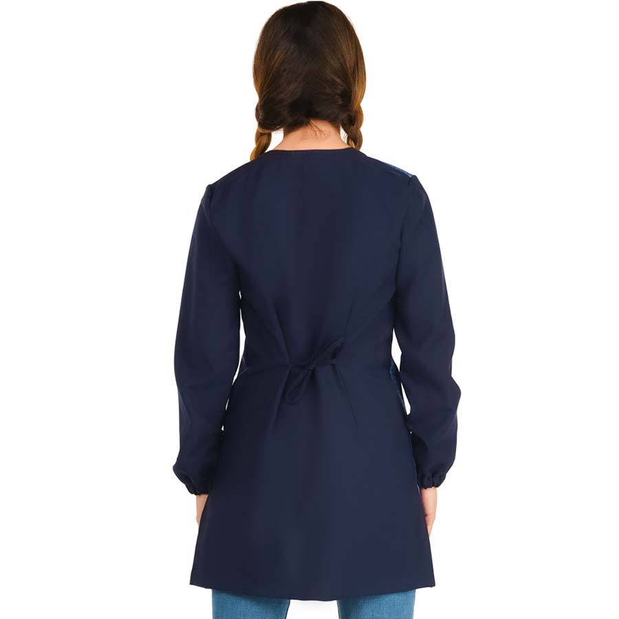 Su diseño funcional se adapta perfectamente a las exigencias del aula o cualquier espacio educativo. Dispone de manga larga con puños elásticos, cierre frontal con botones, cinturilla trasera ajustable con lazos, y un bolsillo doble en el delantero que aporta practicidad sin perder estética.