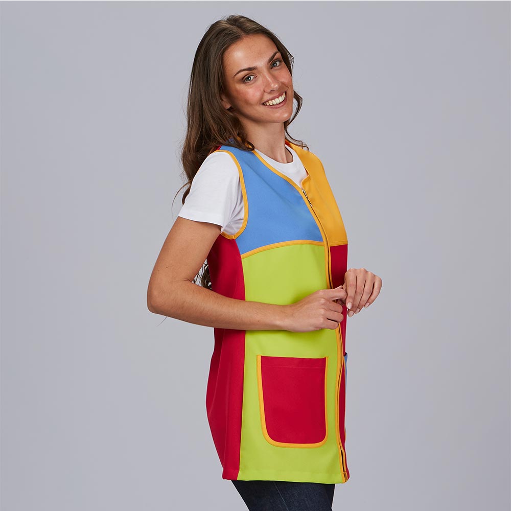 Blusa maestra Visual con corte evasé, delantero multicolor, espalda fucsia y bolsillos combinados. Comodidad con personalidad para maestras creativas.
