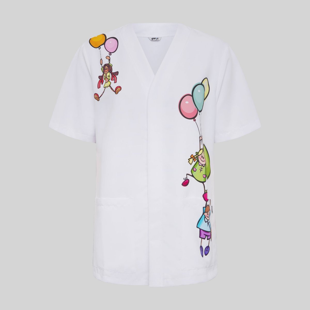 Esta blusa es ideal para profesionales sanitarios, personal de clínicas pediátricas, guarderías, centros educativos o incluso negocios relacionados con el cuidado y atención al público infantil. Su estampado alegre ayuda a generar un ambiente más cercano y agradable, mientras que su tejido técnico facilita el trabajo diario gracias a su resistencia y fácil mantenimiento.