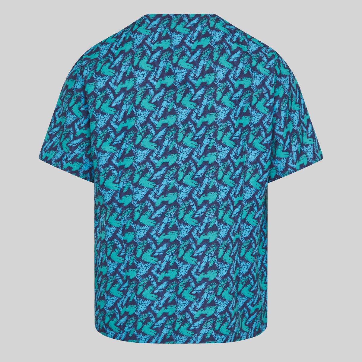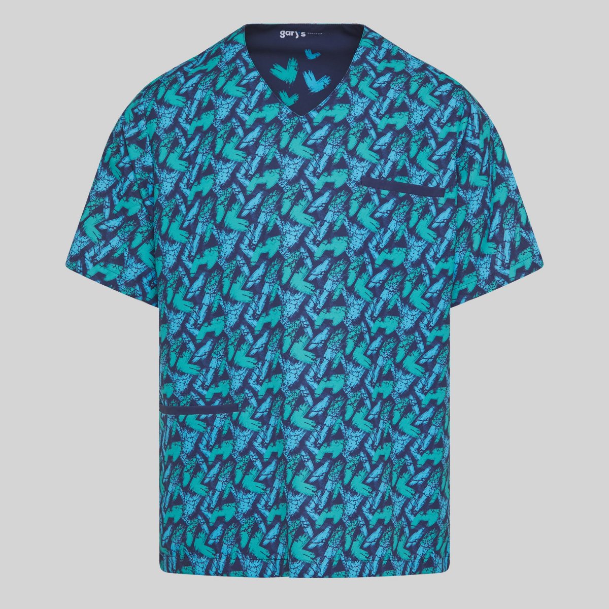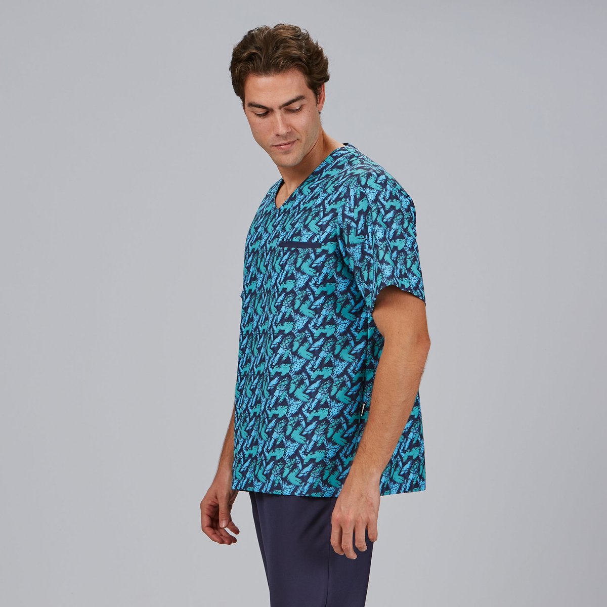 Blusa sanitaria estampada Marino unisex en microfibra técnica, con escote en V, manga corta, dos bolsillos delanteros y aberturas laterales para mayor comodidad.