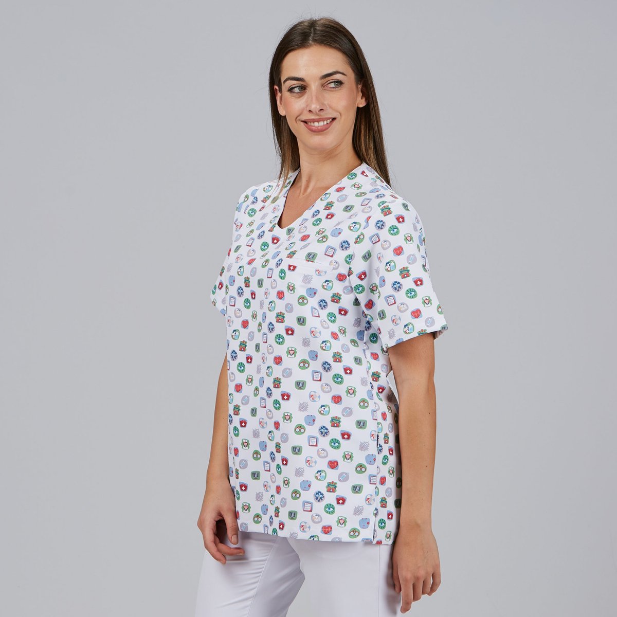 La blusa sanitaria estampada Vital unisex es perfecta para profesionales de hospitales, clínicas, farmacias, centros de estética, veterinarias, residencias y espacios de bienestar. Su diseño está pensado para quienes necesitan una prenda cómoda, fresca y funcional que permita trabajar con soltura sin renunciar a una imagen profesional y actual.