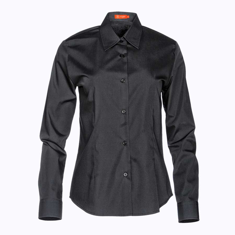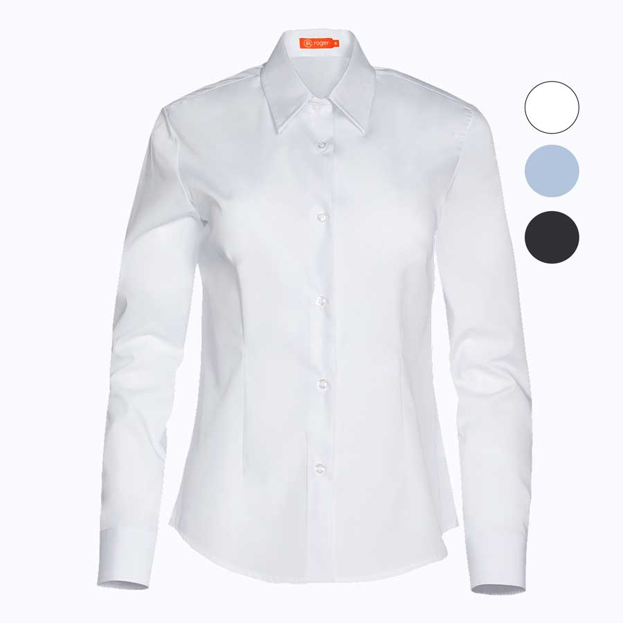 Camisa de camarera, para mujer, de mangas largas, cuello camisero, con botones centrales y sin bolsillos.