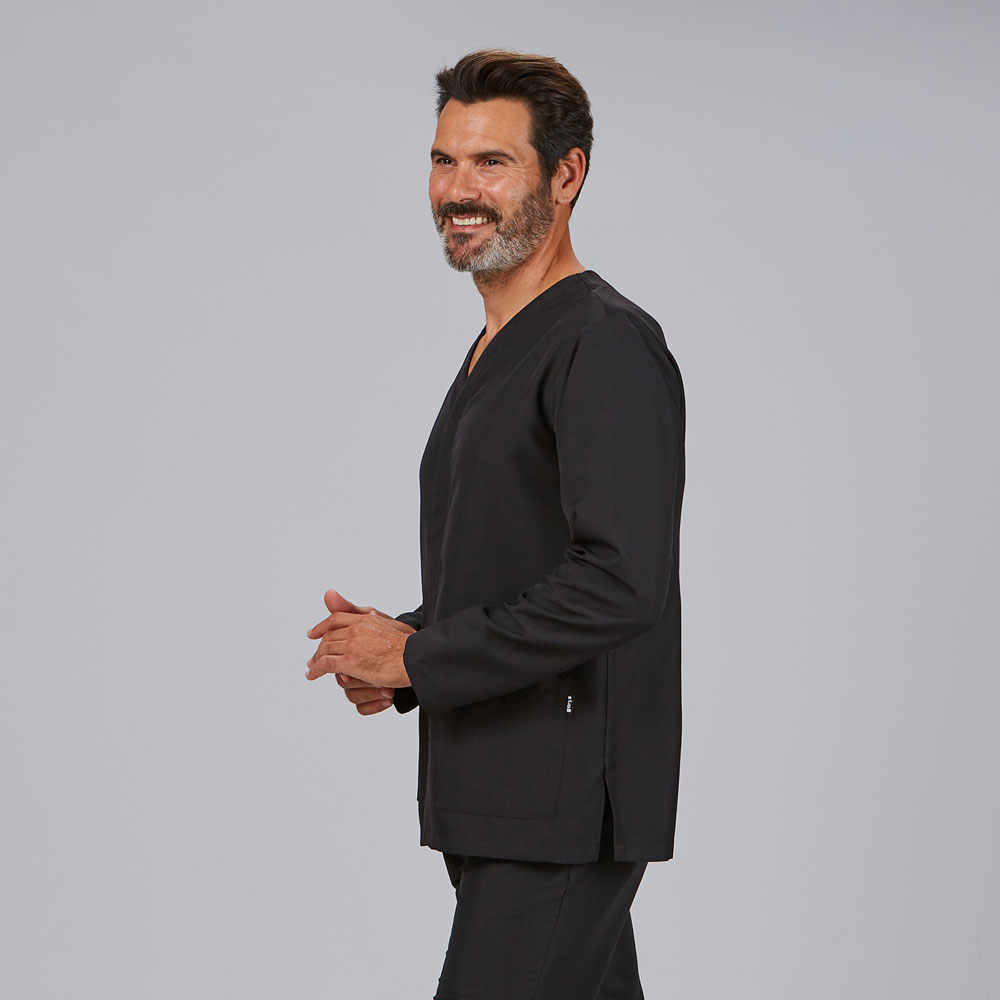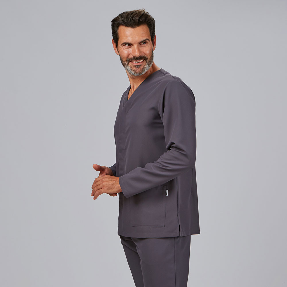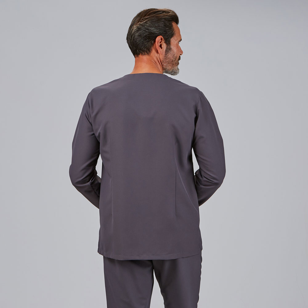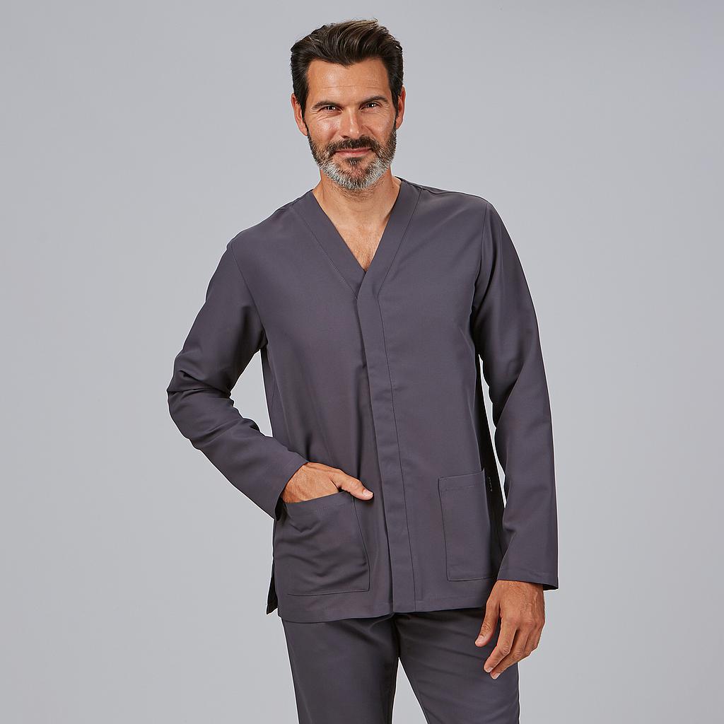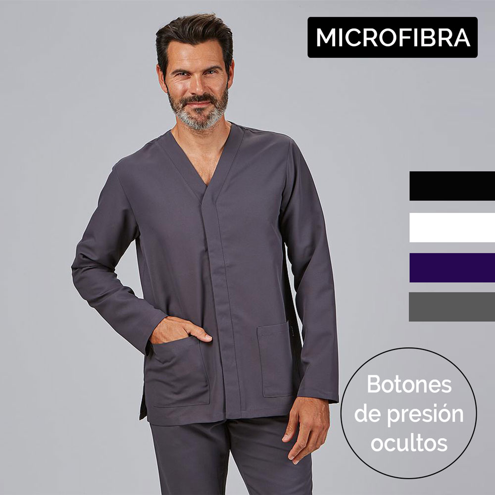 Casaca de uniforme sanitario de hombre en tejido MICROFIBRA, con cuello de pico, mangas largas, cierre central con botones ocultos y dos bolsillos.