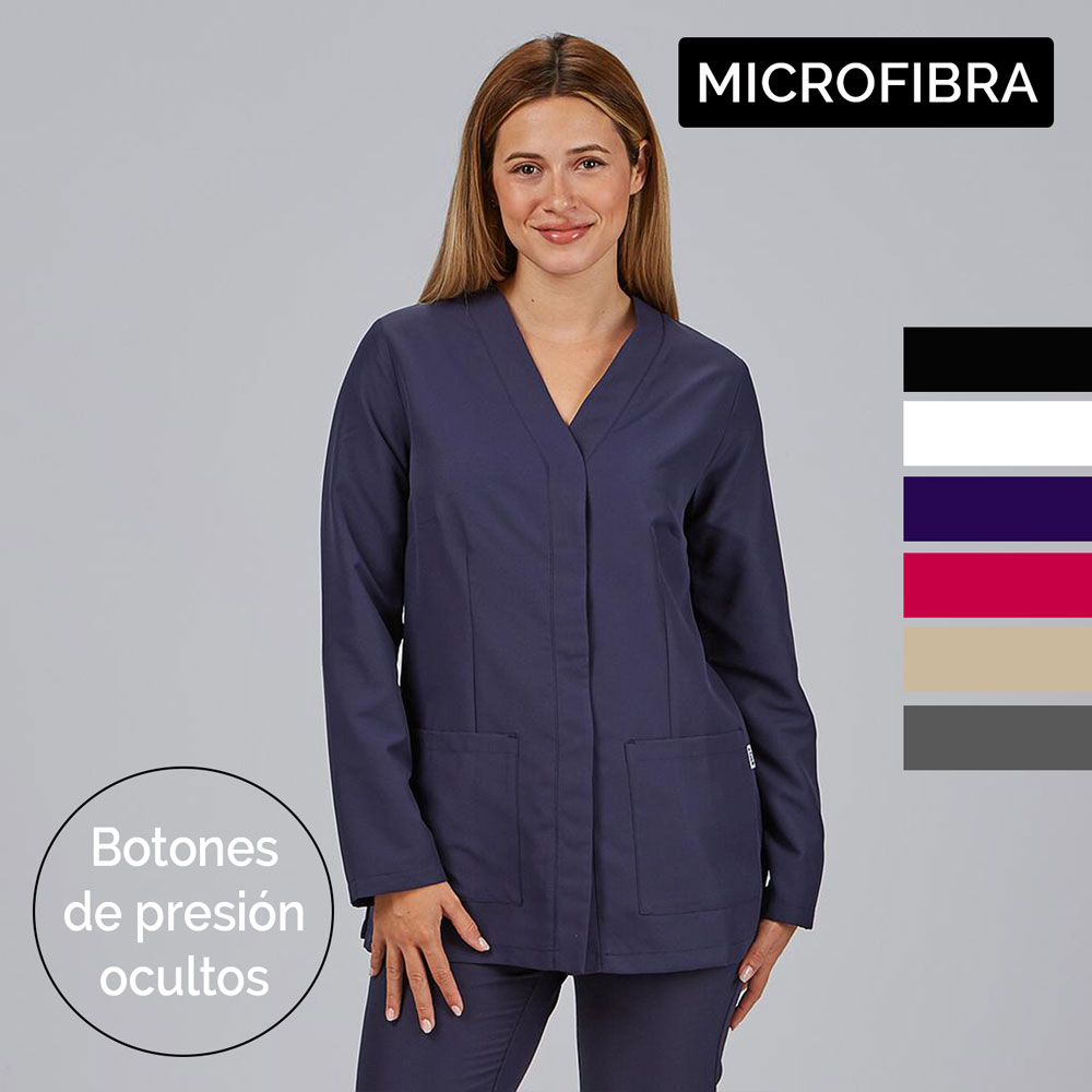 Casaca de uniforme sanitario de mujer en tejido MICROFIBRA, con cuello de pico, mangas largas, cierre central con botones de broche, ocultos y dos bolsillos.