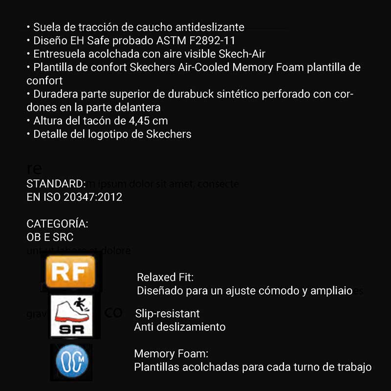 La entresuela visible con amortiguación de aire Skech-Air® garantiza una sensación de ligereza y suavidad con cada pisada, absorbiendo el impacto para que puedas moverte con confianza y sin esfuerzo. Además, la suela antideslizante resistente a aceite te ofrece una tracción excepcional en una variedad de superficies, proporcionándote seguridad en cada paso que des, incluso en entornos laborales exigentes.
