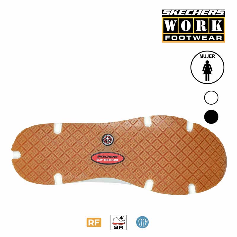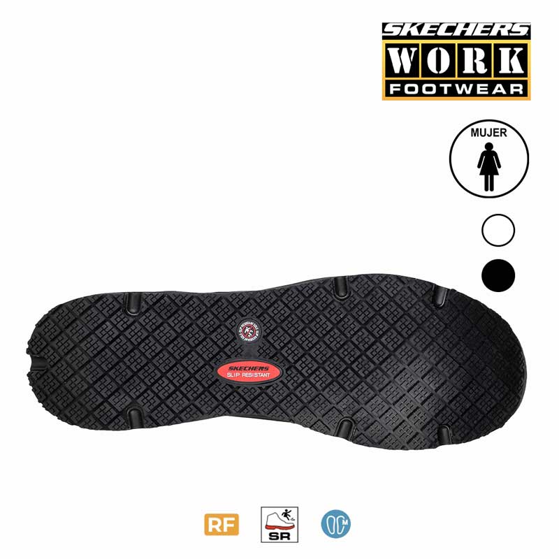 Calzado Skechers laboral en 2 colores (negro o blanco) para mujer, con suela antideslizante resistente a aceite, entresuela visible con amortiguación de aire Skech-Air®, y plantilla acolchada Air-Cooled Memory Foam®. Diseño testado contra el peligro eléctrico (EH). Estilo deportivo y moderno para trabajar.