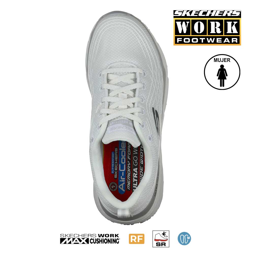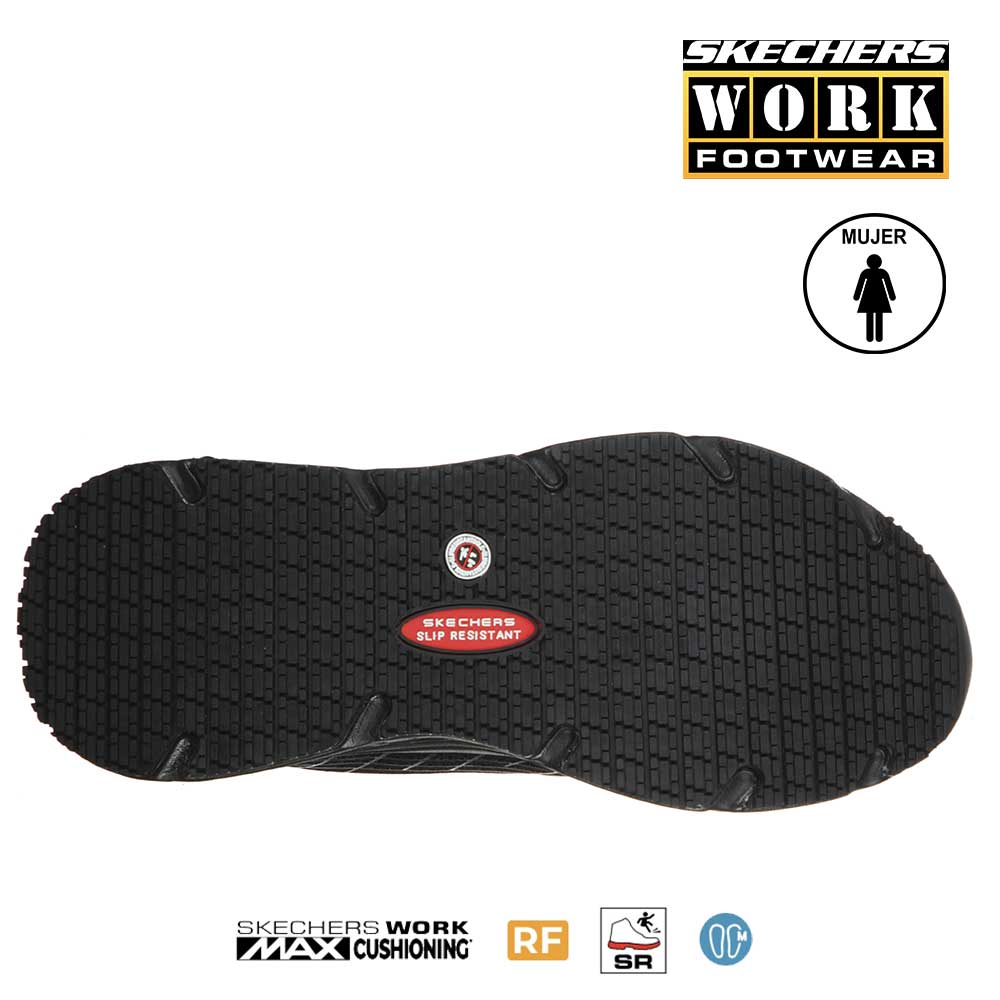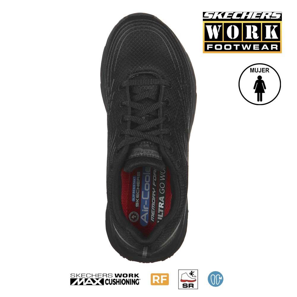 Zapatillas laborales y para caminar de mujer, marca Skechers, con cordones, plantilla “Memory Foam” (acolchadas) con efecto amortiguador, rejilla transpirable, antideslizante en suelos de baldosa y acero y suela resistente a aceite e hidrocarburos. Diseño deportivo y moderno para trabajar.