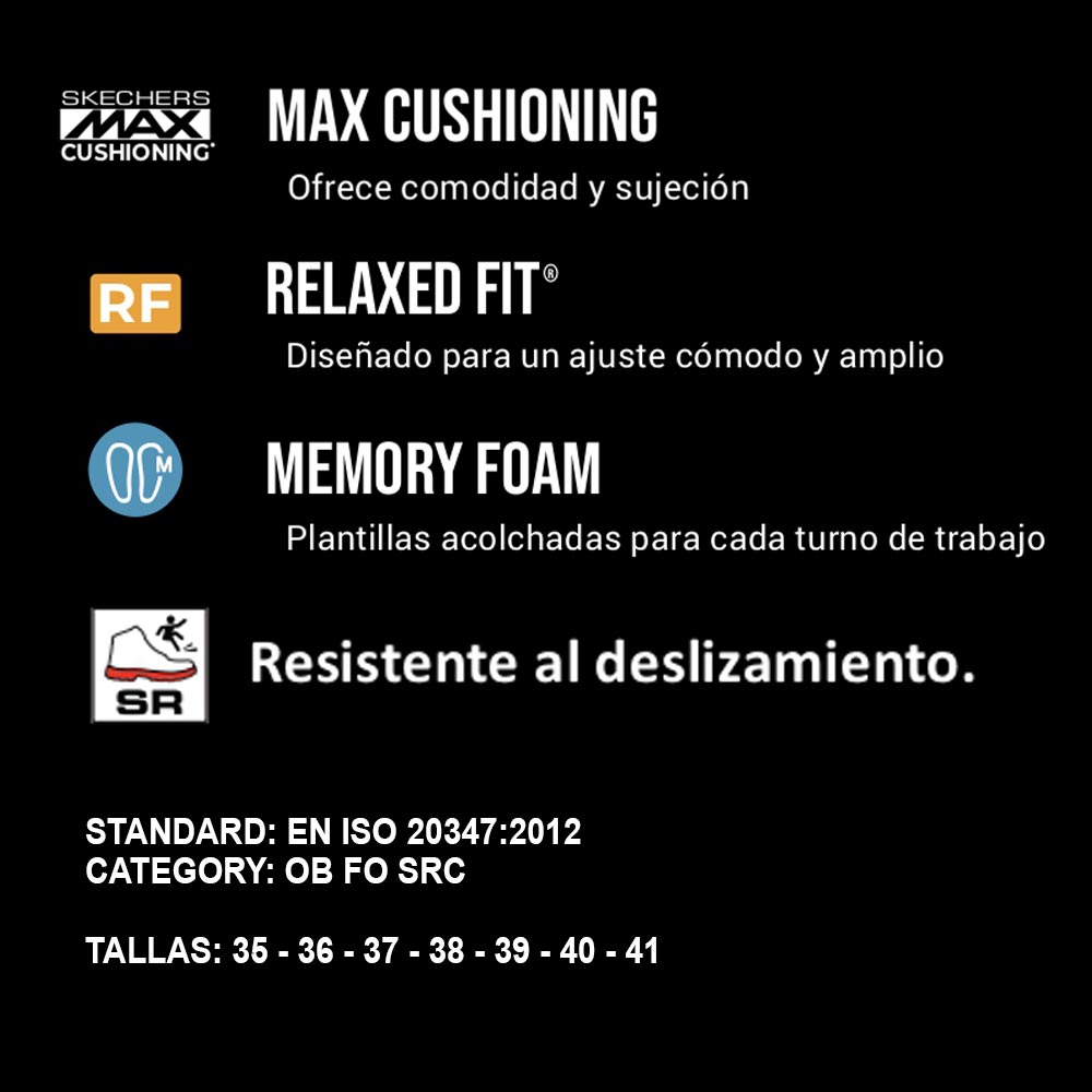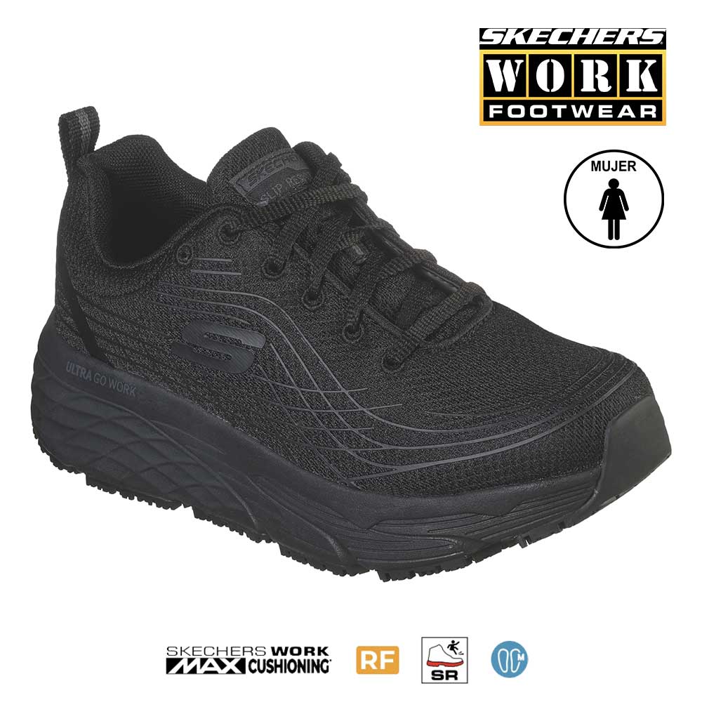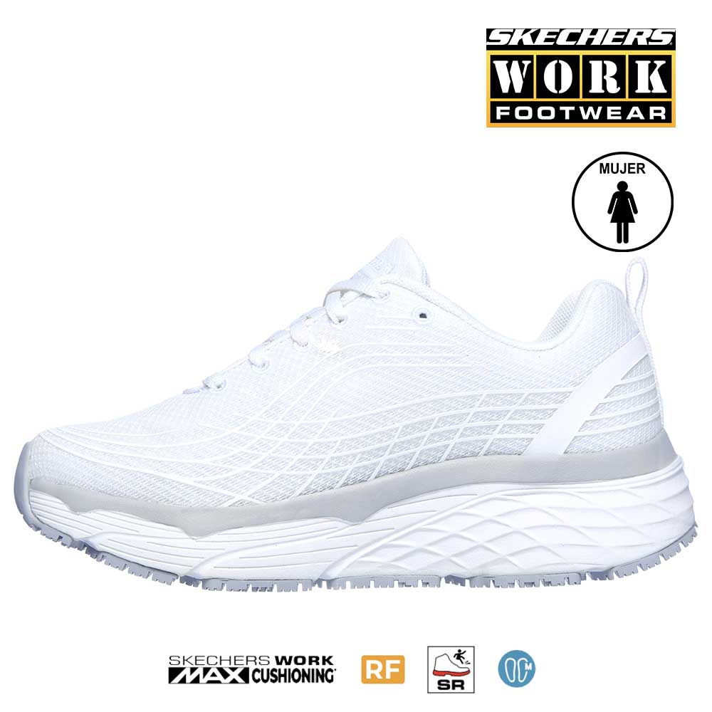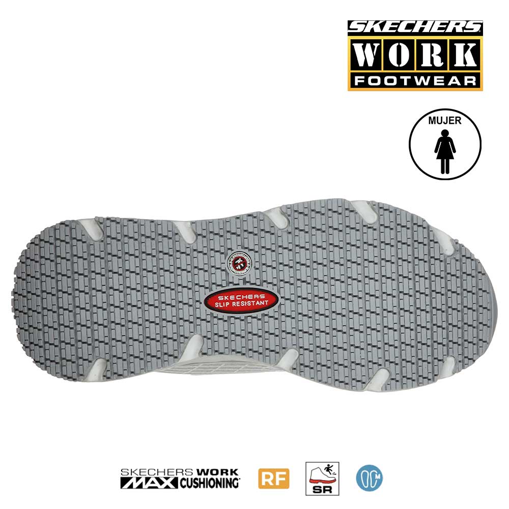 Zapatillas laborales y para caminar de mujer, marca Skechers, con cordones, plantilla “Memory Foam” (acolchadas) con efecto amortiguador, rejilla transpirable, antideslizante en suelos de baldosa y acero y suela resistente a aceite e hidrocarburos. Diseño deportivo y moderno para trabajar.